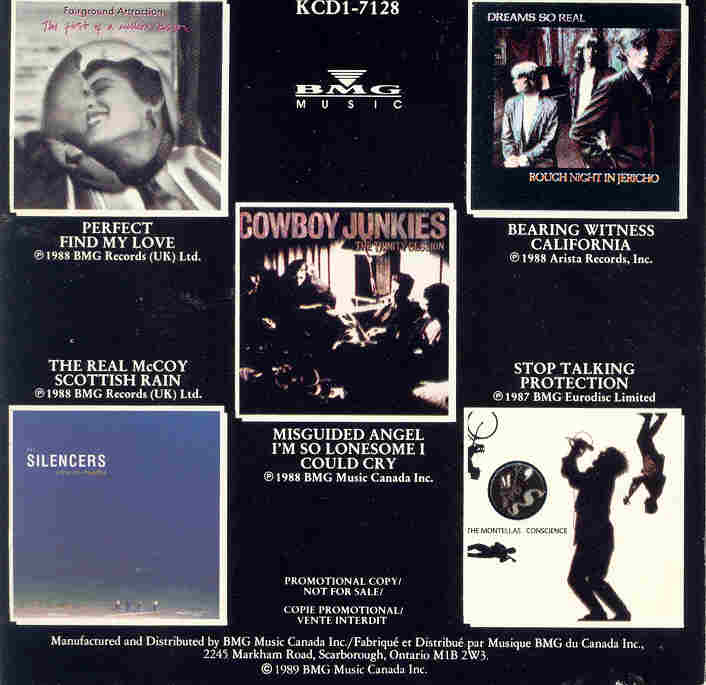 ![]() | Spring Breakers Promo Release 1989 Track 5. Misguided Angel 4:58 Track 6: I’m So Lonesome I Could Cry 5:24 A promo release featuring 2 songs from 5 different bands. The inside cover includes the following “Since they formed two years ago, Cowboy Junkies’ music has been referred to as “post-modern melancholy”. The band pares their musical arrangements down to the essence of country, folk and blues, baring the song’s soul and capturing the core of its meaning. Built around the ethereal, plaintive voice of Margo Timmins and the simple, accomplished guitar work of brother Michael, they draw their audience, as one listener puts it, “further and further into a hypnotic whirlpool of sound”. Joining Margo and Michael in the band are brother Peter (drums) and lifelong friend Alan Anton (bass)”. BMG Canada KCD1-7128 |