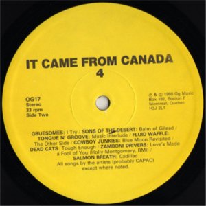 ![]() ![]() xxxxxxxxxxxxxxxxxxxxxxxxxxxx | It Came From Canada 4 Vinyl Released 1988 OG17 Although it was recorded the same day as the rest of the album, The Latent Records version of The Trinity Session did not include Blue Moon Revisited. The song was left out to ensure the record didn’t run too long and reduce the quality of the vinyl. Blue Moon Revisited first appeared as part of this collection, song 5 of side two, distributed by Og Records of Montreal. When The Trinity Session was re-issued by RCA/BMG, Blue Moon Revisited was included. From the back cover of the album: COWBOY JUNKIES have been described as ‘like listening to molasses,’ which is about right: slow, dark, sweet. They’re also a bit psychedelic and strangely disturbing, unlike molasses. From Toronto. Margo Timmins, vocal; Michael Timmins, guitar; Alan Anton, bass; Peter Timmins, drums. Recorded at Trinity. |