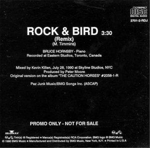 ![]() | Rock and Bird (remix) Promo CD Released 1990 Featuring Bruce Hornsby on piano Recorded at Eastern Studios, Toronto, Canada Produced by Peter Moore 2701-2-RDJ |