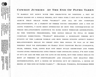 ![]() ![]() | At The End of Paths Taken Promo Release Early 2007 Two versions of the advanced copy of the album: “I rarely sit down with the objective of writing a set of songs based on a single theme, but this time I set out to write an album that dealt with “Family” and all of its complex relationships. As a parent of three young children and a son of aging parents, I have been intrigued by how the consequences of those relationships continue to echo down through generations. As the writing progressed, the songs began to pull in more complex directions. “Family” remained a dominant theme but events of the larger world and how those events affect family relationships began to creep into the songs. It was as if the themes that we explored on Early 21st Century Blues (violence, fear, greed, war, loss) had not been fully exorcised and were insinuating themselves into these very intimate songs. I’m not sure if it’s my age or the age we live in or both, but the songs began to hint at themes of inevitability and finality; not exactly predetermination, but a sense of running out of choices, a sense of being at the end of paths taken.” – Michael Timmins, November 2006 Shown at top: Cooking Vinyl UK COOKCD 401-CDR Shown at bottom: Rounder Records US Zoe 01143-1097-2A |