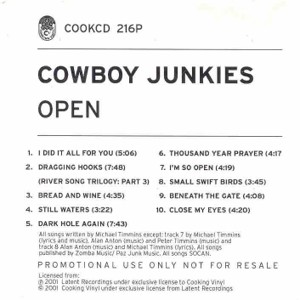 ![]() | Open Promo Release Spring 2001 Advanced copy of the Studio album Open, no artwork beyond the simple song listing shown. Cooking Vinyl UK COOKCD 216P LC 7180 |