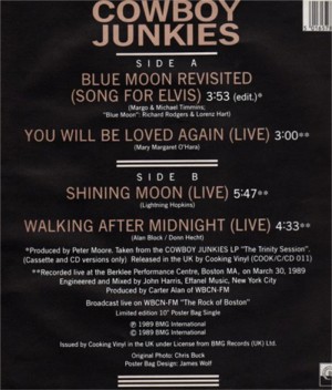 ![]() | Blue Moon Revisited 10″ 45 Vinyl Poster Bag Single Released 1989 Side A 1. Blue Moon Revisited 2. You Will Be Loved Again (Live) Side B 1. Shining Moon (Live) 2. Walking After Midnight (Live) Live songs recorded live at the Berklee Performance Center, Boston, MA, on March 30, 1989, Poster Bag Design: James Wolf Cooking Vinyl FRYX 011 |