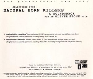![]() | Selections from Natural Born Killers Promo Release 1994 1. Cowboy Junkies – Sweet Jane 2. Leonard Cohen – The Future Back artwork only as shown. The beginning of this song ‘features’ Woody Harrelson and Juliette Lewis with dialogue from the movie. Nothing/Interscope PRCD-5899 |