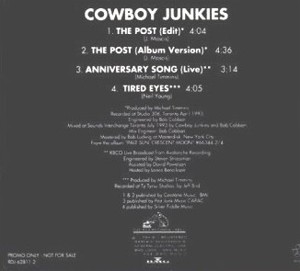 ![]() | The Post Promo Release 1994 1. The Post (edit) 4:04 2. The Post (album version) 4:36 3. Anniversary Song (live) 3:14 4. Tired Eyes 4:05 Track 2 from Pale Sun, Crescent Moon Tired Eyes has never been released on a Cowboy Junkies CD, however it is available on Out of the Blue: An Acoustic Tribute to Neil Young |
