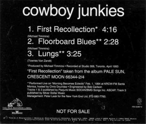 ![]() | First Recollection Promo Release 1994 1. First Recollection 4:16 2. Floorboard Blues 2:28 3. Lungs (Townes Van Zandt) 3:25 Track 1 from Pale Sun, Crescent Moon recorded at Studio 306, Toronto, April 1993 Tracks 2 and 3 performed live on “Morning Becomes Eclectic”, February 1, 1994 at KRCW-FM in Sanat Monica. Lungs is not available on any Studio CD. RCA US: RDJ 62887-2 |
